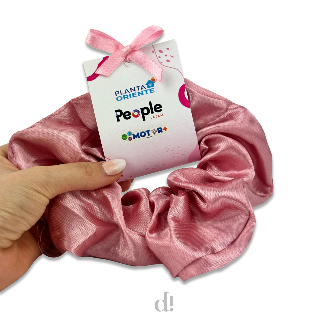 Cada scrunchie está elaborado con telas de alta calidad y con una tarjeta que puede personalizarse con el logo de tu empresa, una frase especial o un mensaje de agradecimiento.
