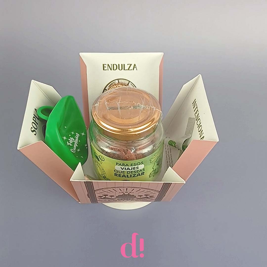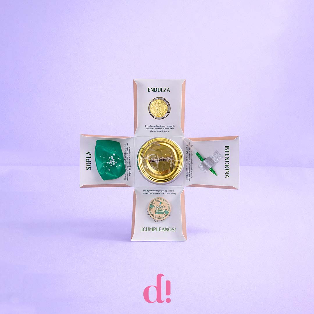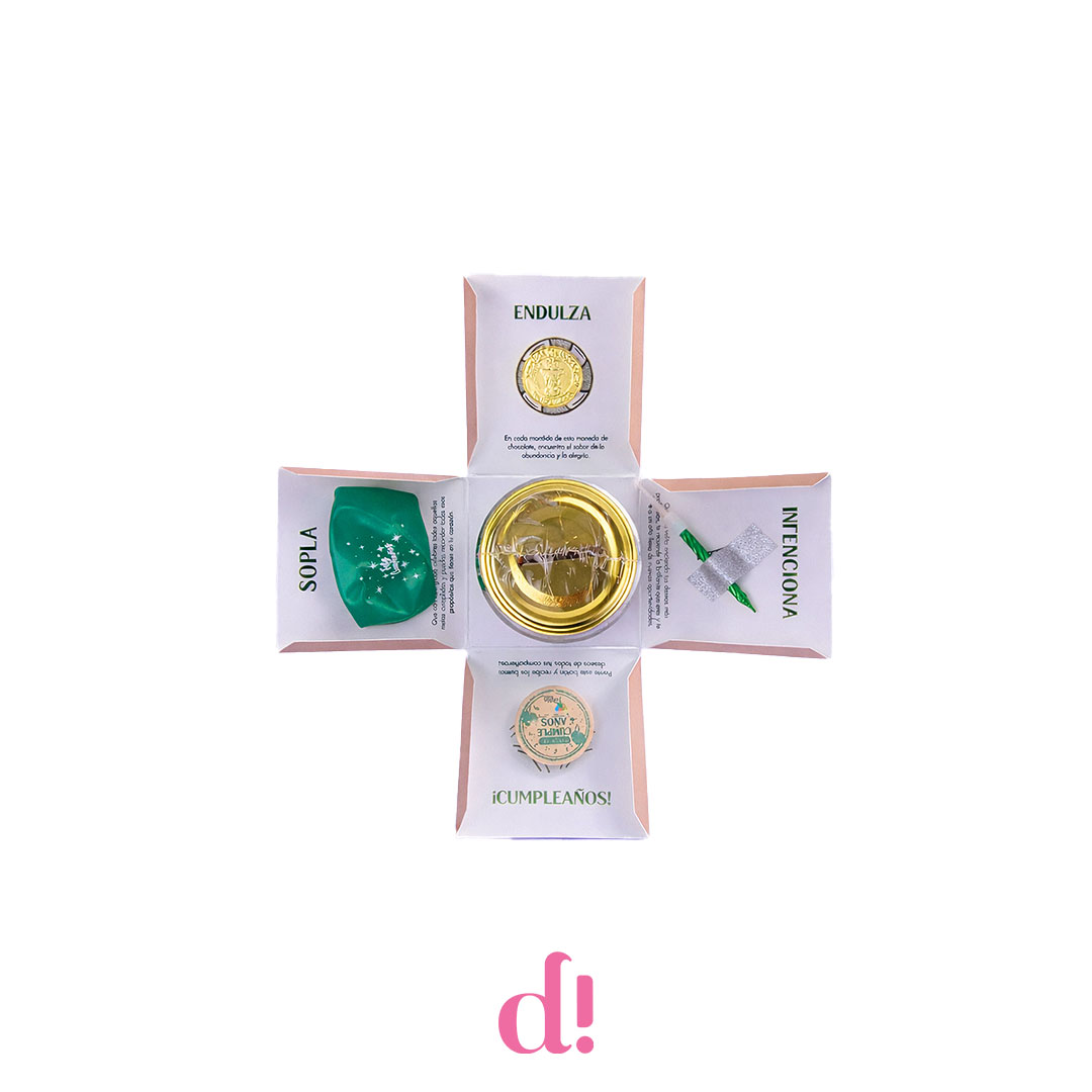Incluye: Botón cumpleañero, Vela para pedir deseos, Bomba de cumpleaños, Moneda de chocolate como símbolo de fortuna, Mini alcancía llena de galletas para endulzar el momento.