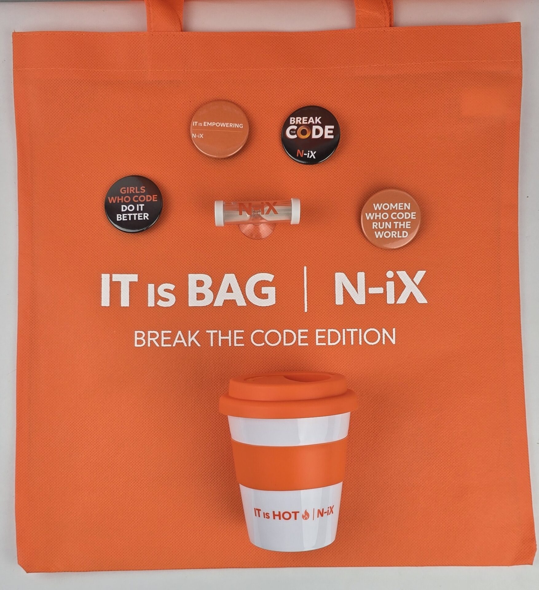 Diseñado para acompañar la experiencia del evento Break the Code: Women in Tech, este kit combina funcionalidad, estilo y presencia de marca en cada detalle. Incluye una tote bag resistente y práctica para uso diario, un termo para café ideal para jornadas largas, botones publicitarios que refuerzan identidad y pertenencia, y un reloj de arena decorativo que simboliza enfoque, tiempo y propósito.