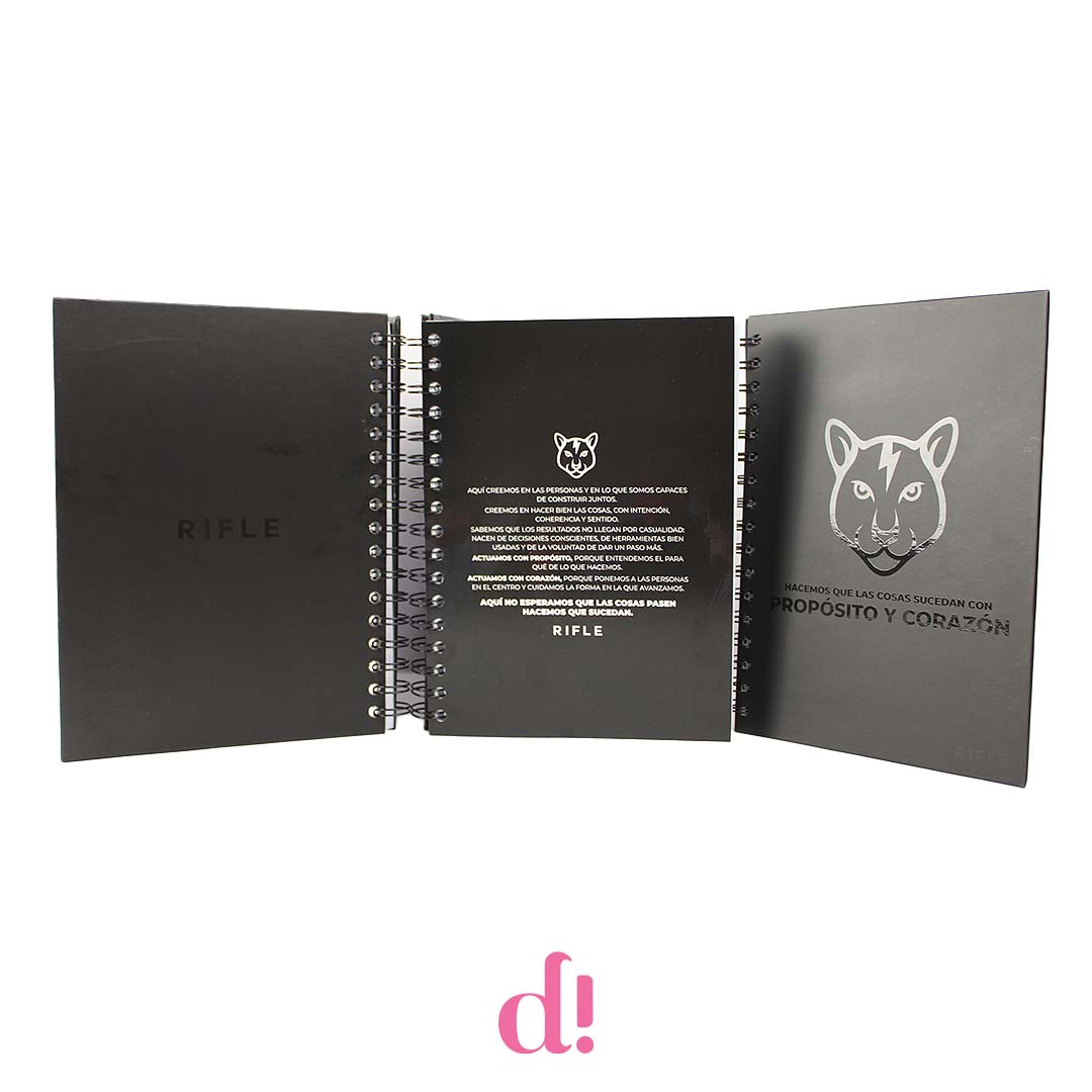 Este cuaderno premium con acabado mate, desarrollado para Rifle, combina diseño sobrio, textura elegante y presencia corporativa. Su cubierta con terminación mate aporta una sensación sofisticada al tacto, mientras que la personalización refuerza el carácter y estilo de la marca.
