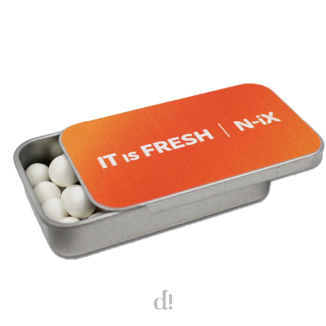 Un detalle fresco y elegante que deja huella. Estas mentas personalizadas vienen en una práctica lata metálica deslizante, ideal para acompañar reuniones, ferias y eventos corporativos.