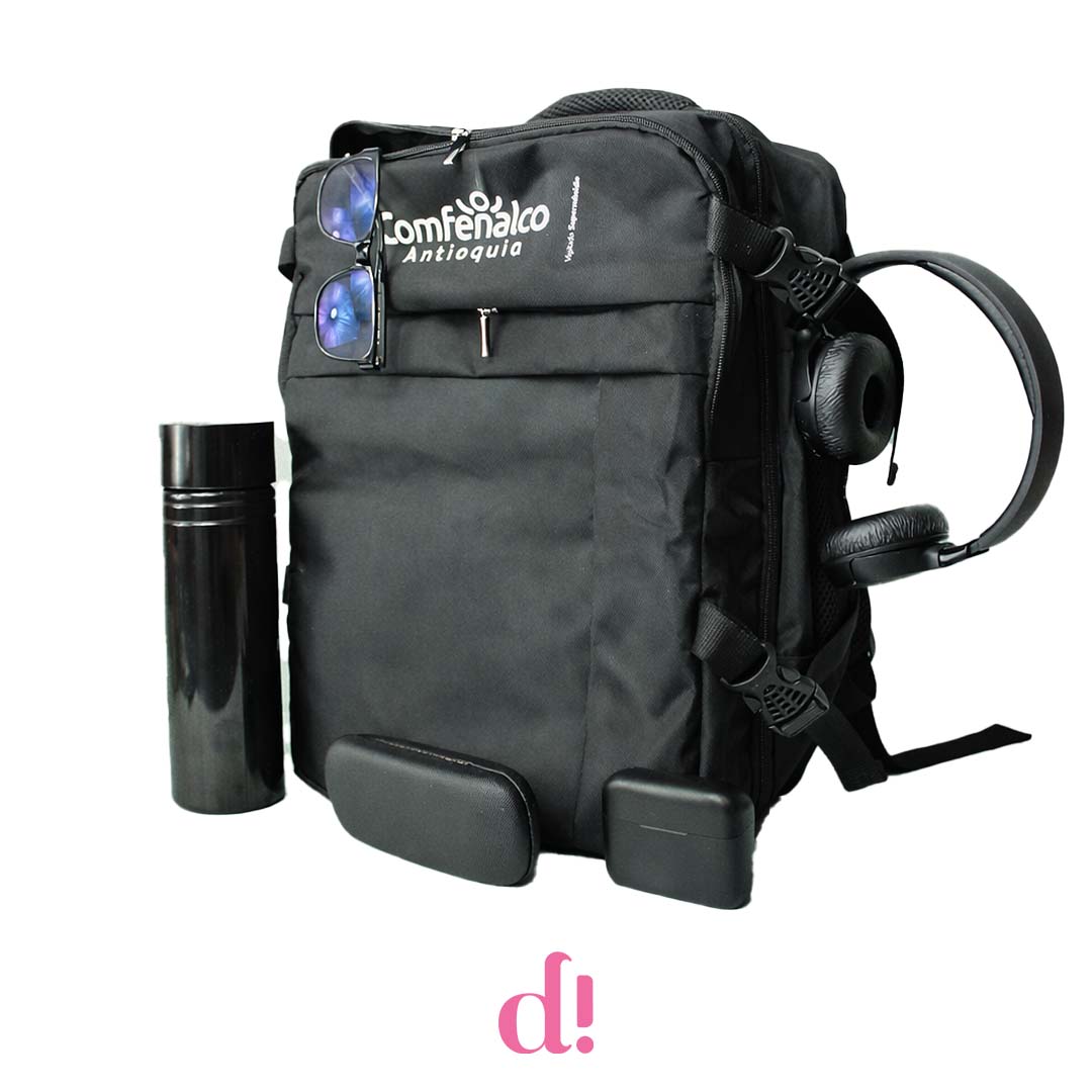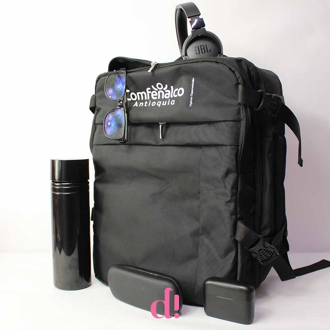 Este morral corporativo personalizado para Comfenalco fue diseñado como un elemento práctico y versátil para el día a día. Con un diseño moderno y resistente, combina capacidad, comodidad y presencia de marca en un solo producto.