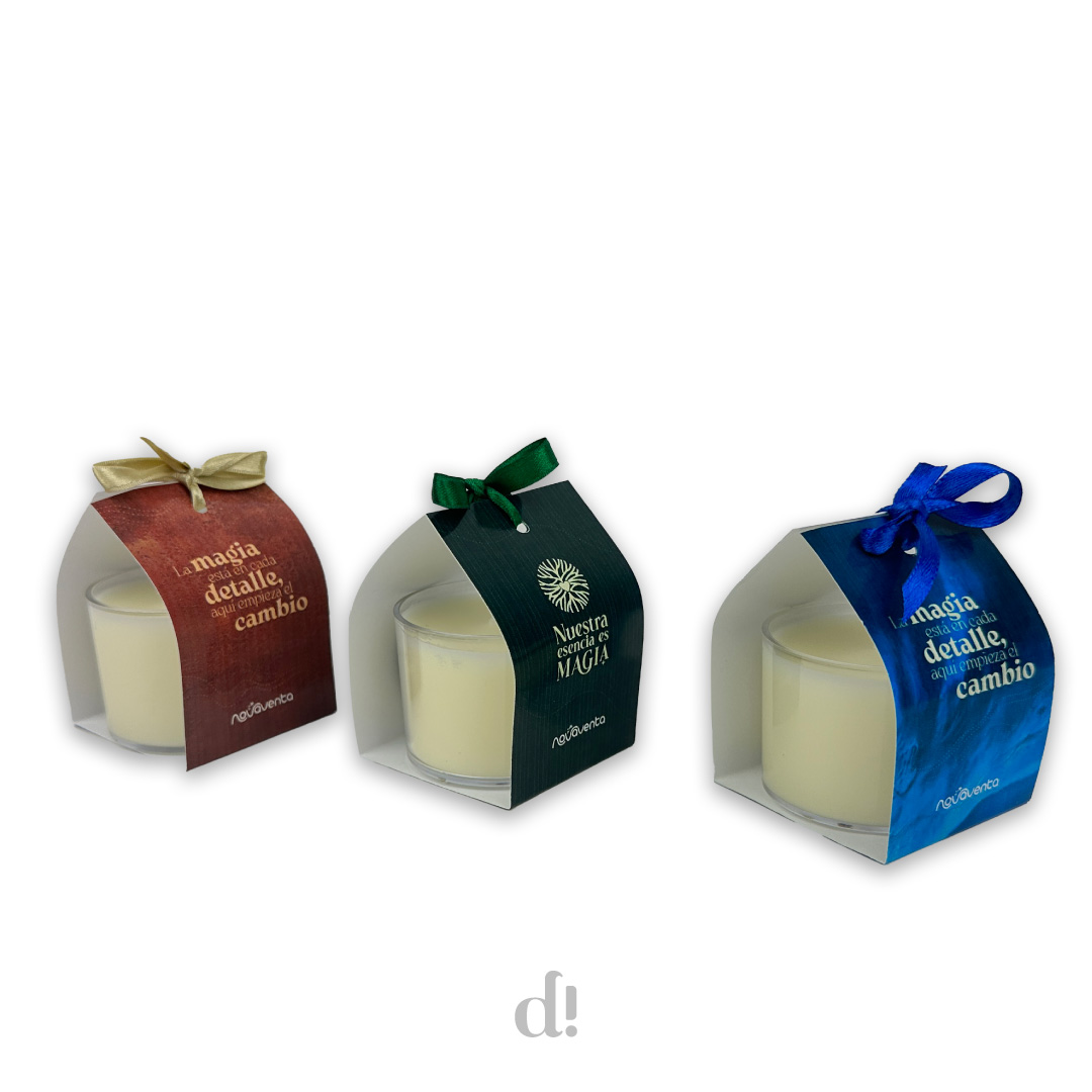 Este elegante conjunto de 3 velas pequeñas es el detalle perfecto para transmitir gratitud, cercanía y cuidado en cada obsequio corporativo. Cada vela está decorada con una delicada cenefa alrededor que resalta su presentación artesanal y cálida.
