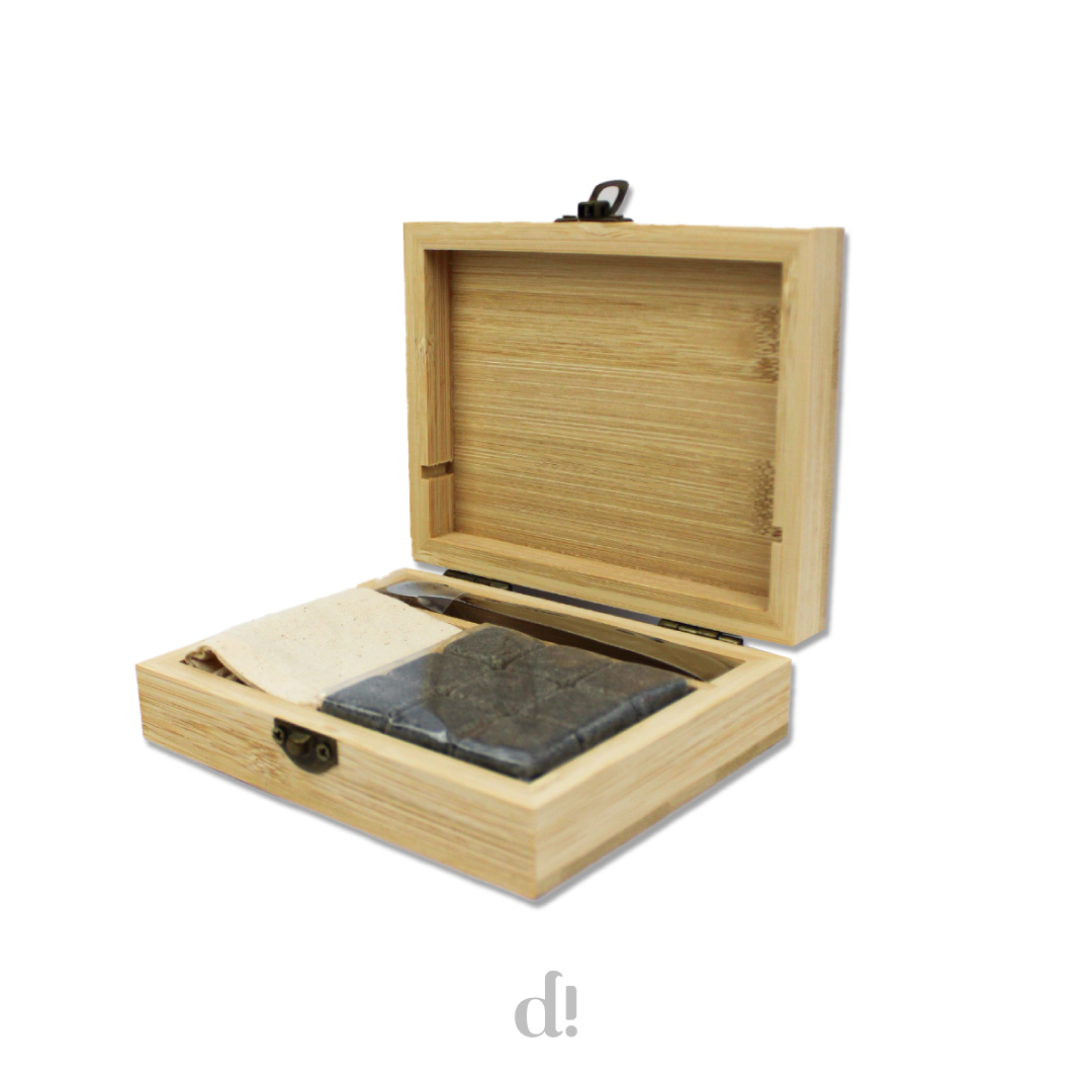 Un obsequio elegante y funcional diseñado para realzar la experiencia de cualquier bebida. Este set incluye hielos reutilizables elaborados en piedra, ideales para mantener la temperatura sin alterar el sabor. Su presentación en un estuche de bambú grabado con láser aporta un valor diferencial que transmite sofisticación y sostenibilidad.