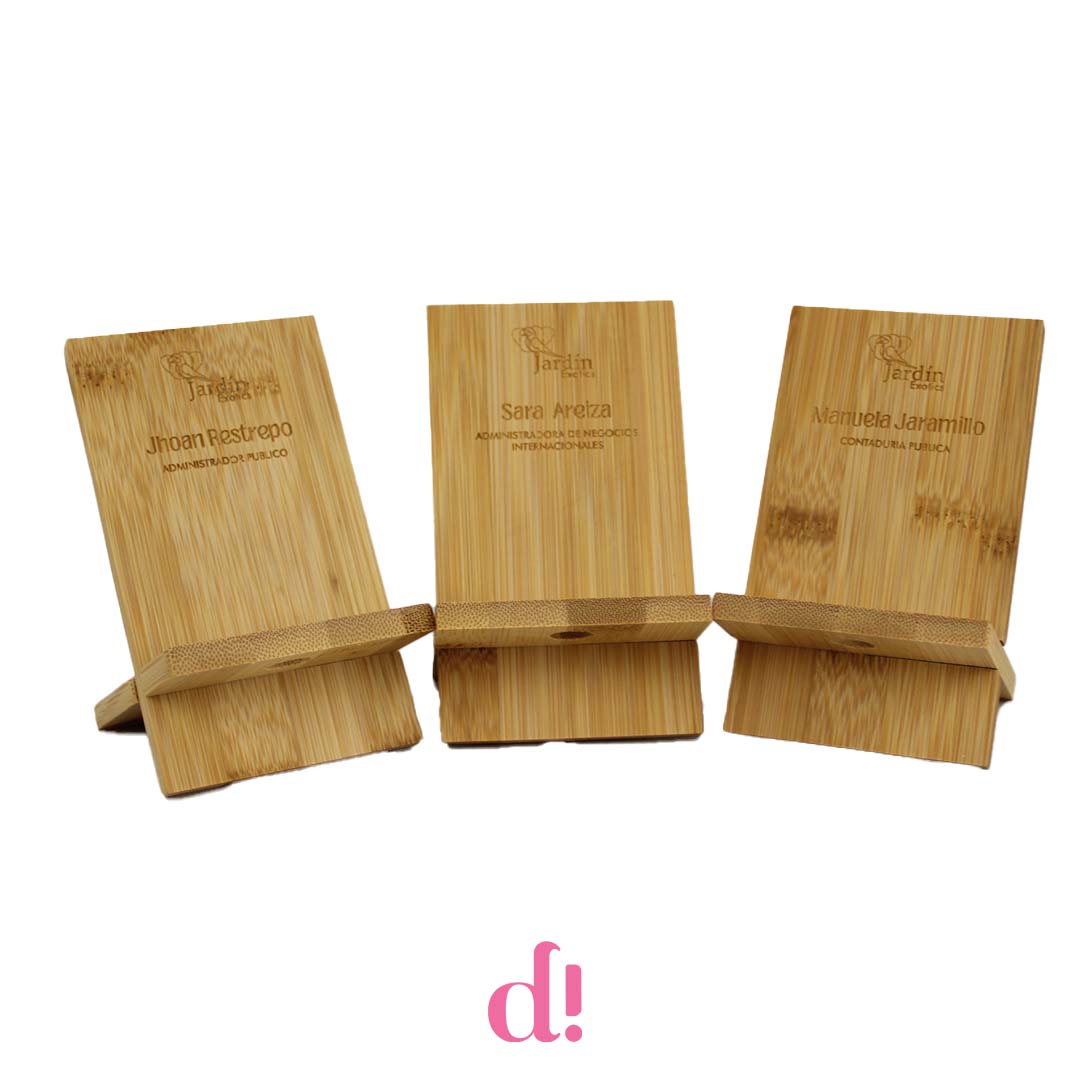 Un detalle funcional que se convierte en símbolo de pertenencia. Este soporte para celular en madera fue desarrollado para Jardín Exotics como una pieza personalizada con marcación láser, incluyendo el nombre y la profesión de cada miembro del equipo.