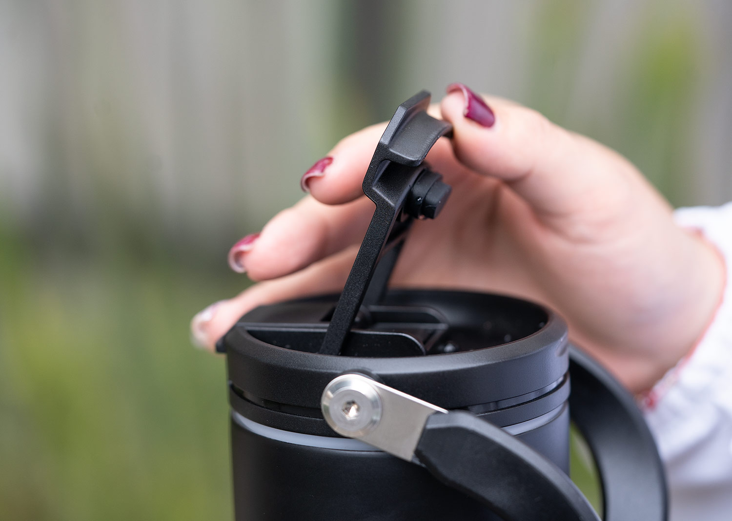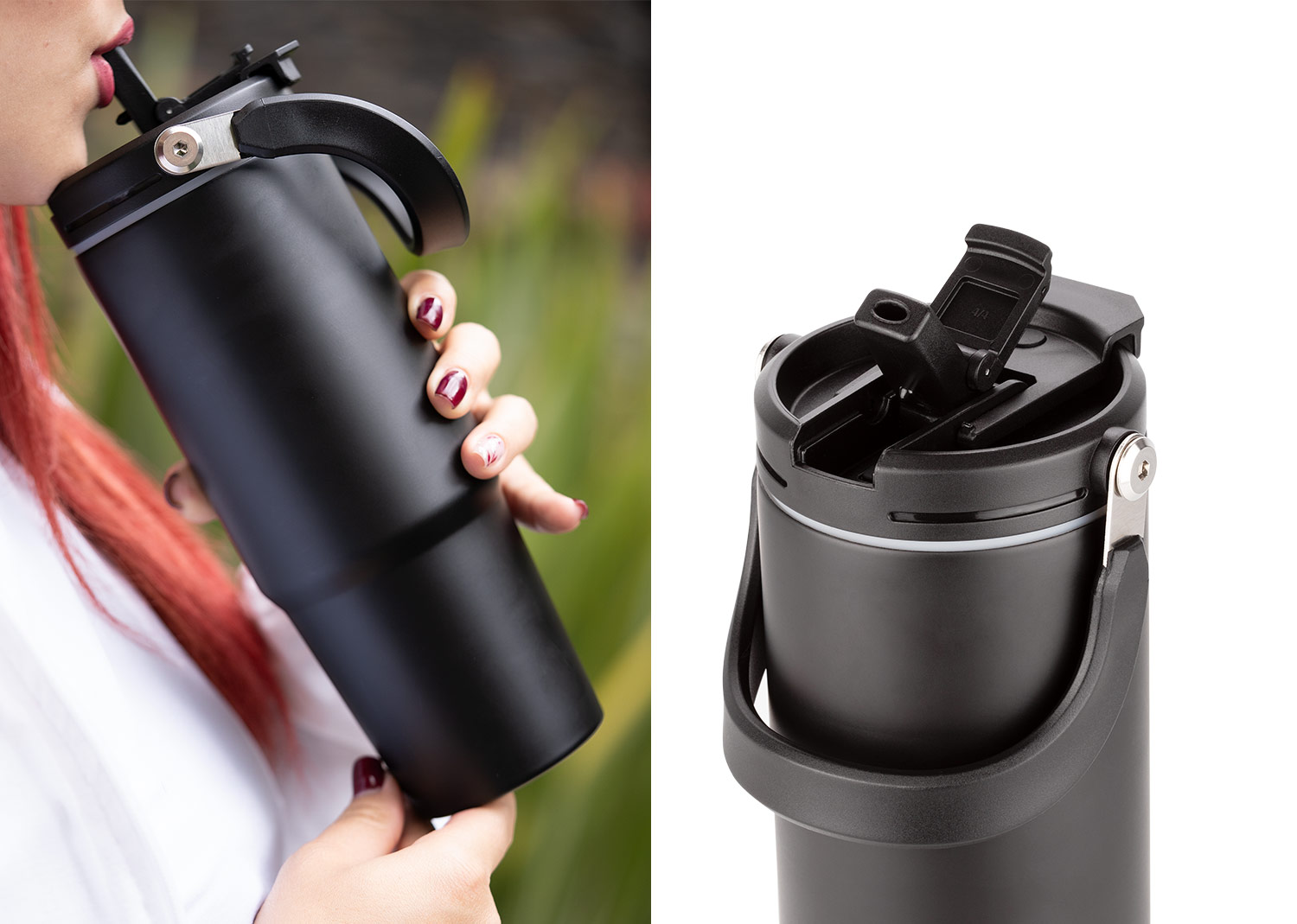 Esta botella metálica es ideal para todo tipo de bebidas. Cuenta con una manija resistente, integrada en la tapa mediante una sólida pieza de metal, que facilita su transporte y almacenamiento. Dispone de dos boquillas para el consumo de líquidos: una tipo boquilla y otra tipo pitillo, ambas con tapas de seguridad. Además, posee un borde de caucho que previene derrames. Mantiene las bebidas frías por 8 horas y las bebidas calientes por 4 horas.