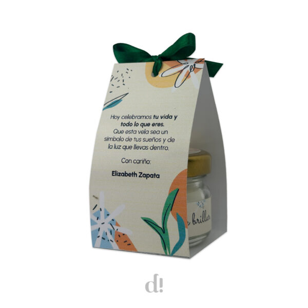 Haz que tu marca brille de una manera cálida y única con nuestras velas personalizadas. Cada vela viene acompañada de un collarín diseñado a medida y un mensaje especial que puede incluir el logo de tu empresa, un agradecimiento o un mensaje inspirador para tus colaboradores, clientes o aliados.