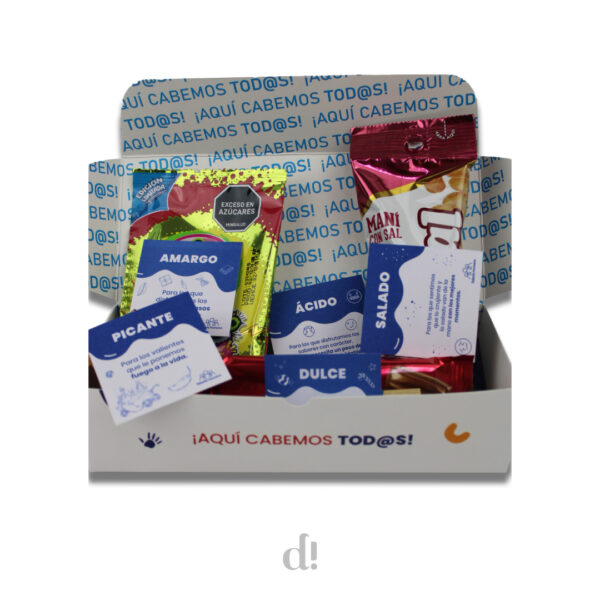Contiene una selección cuidada de golosinas que puede adaptarse a diferentes gustos y ocasiones. La caja puede incluir tu logo, colores institucionales y un mensaje personalizado para lograr una experiencia memorable.